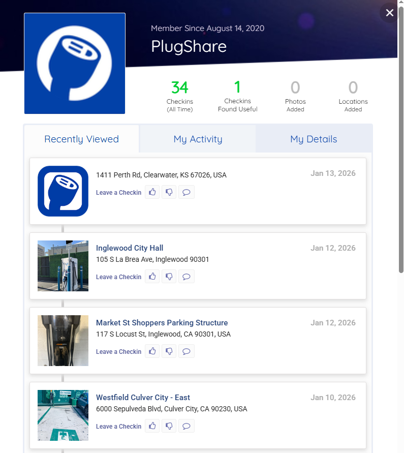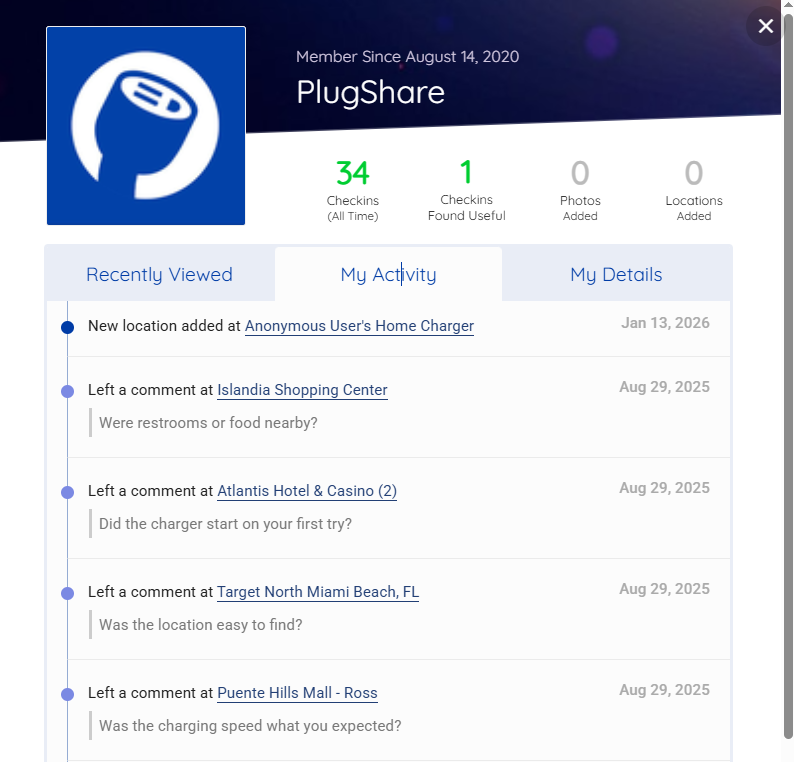 Your Personal Activity will show you an active history of all your location check-ins, uploaded photos, and locations you have added to PlugShare you have made from your PlugShare account.